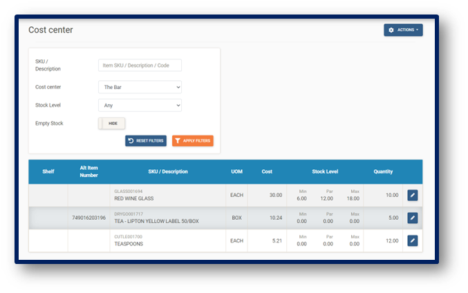 Items can also be searched via the Cost Centers |Cost Centres.png| buttons under the Inventory drop-down menu